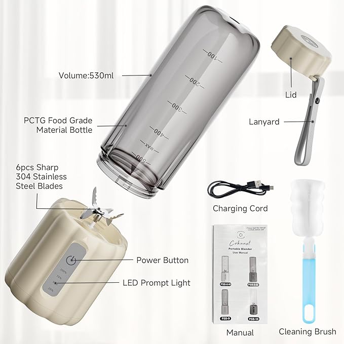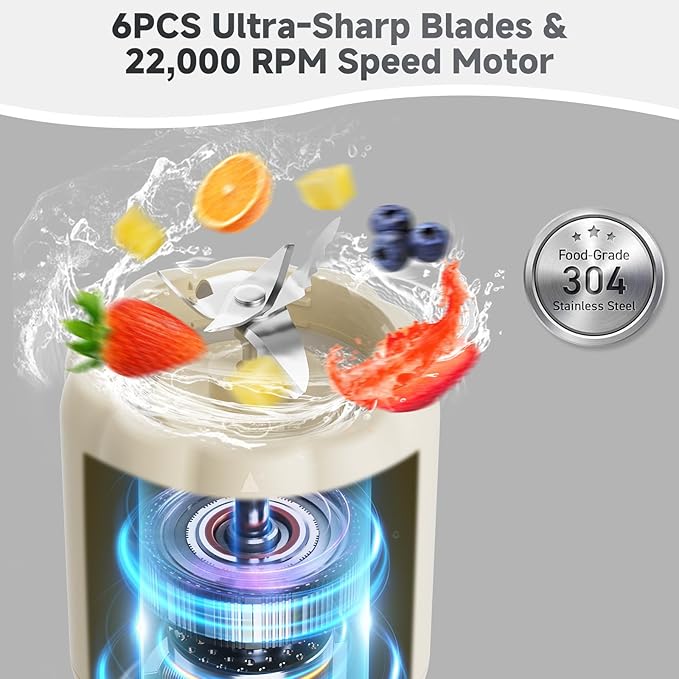 - 【Powerful 6 Blades】Portable mix not only adopts 6 blades and streamlined bidirectional blade technology, but also comes with a 22000 rpm rotational speed, allowing the blades to spin quickly to fully blend the fruits and Protein in the cup