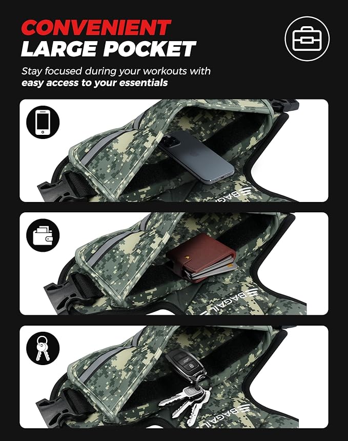 - Convenient & Safe Design: Features a large front pocket to securely hold your phone, keys, or earbuds while exercising. Reflective strips on the shoulders and back improve visibility for outdoor running, hiking, or night workouts, keeping you safe