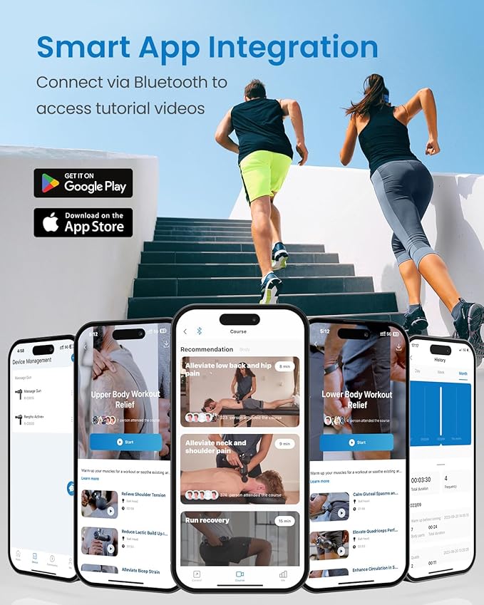 - Smart Massage Gun: Connect to the RENPHO Health App via bluetooth, you can control massagers' speed through the App. Professional video courses from the App provide a visual guide for specific muscle groups to warm up or post workout recovery
