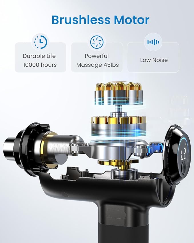 - Powerful Massage Gun Deep Tissue: Equipped with a high-torque brushless motor with 10mm amplitude, the massager gun can deliver up to 45 lbs massage intensity to relieve your tight muscles