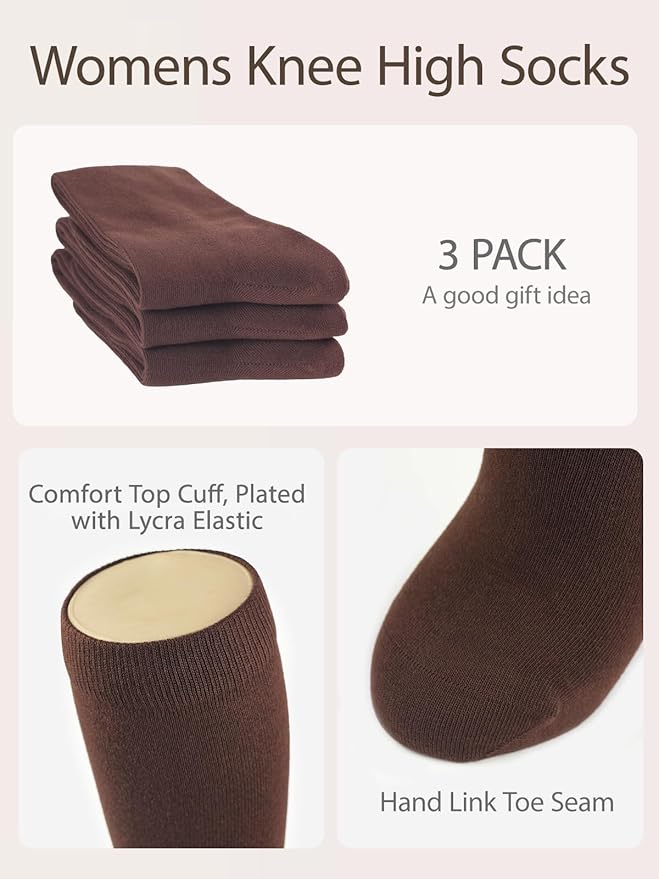 COTTON DAY Women's Soft Combed Cotton Knee High Long Calf Dress Socks Seamless Toe Black White Gray Navy Blue Brown