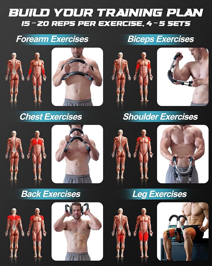 - Multi-Functional Full-Body Workout: Rycid twister arm trainer targets your arms, biceps and triceps, chest, shoulders, back, and legs, providing a full-body workout. It helps build muscle and stamina over time, with noticeable results after consistent use. Recommended: 15–20 reps per exercise, 4–5 sets