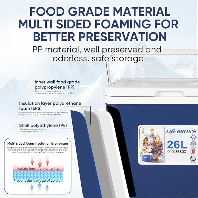 - πΊγ High-quality Insulation γIt is recommended that the ratio of ice to contents be 2:1. The middle insulation layer is made of EPS material, which has excellent insulation and high strength. The heat insulation cover seals the entire space to prevent heat convection and extend the storage time at low temperatures