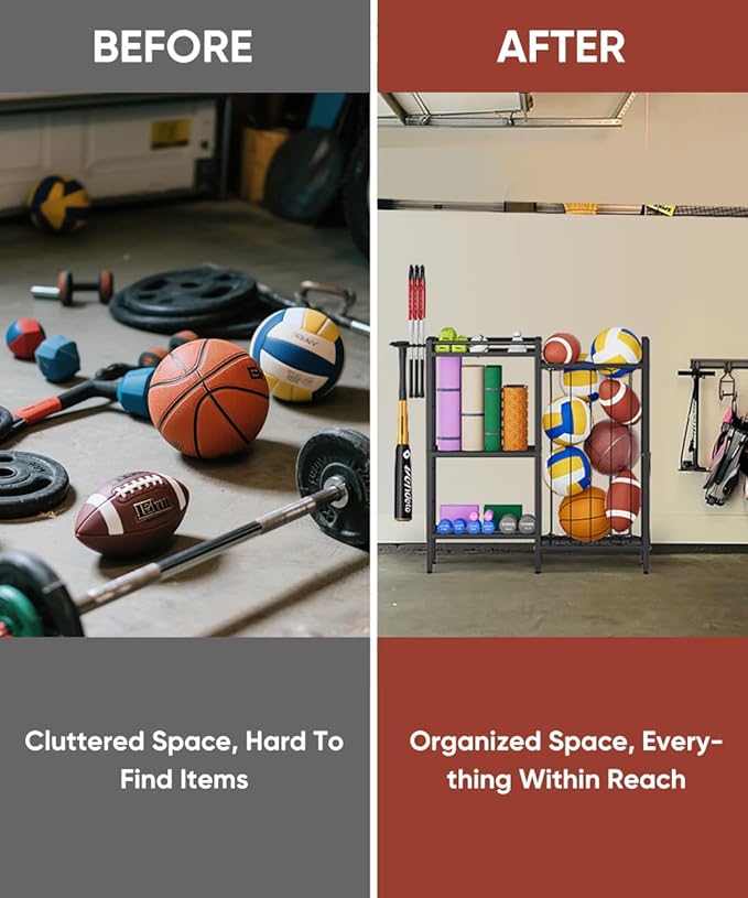- HEAVY-DUTY METAL FRAME: Engineered with premium-grade steel, this exercise equipment storage withstands daily use in garages, gyms, schools, or playrooms. Its rugged build supports substantial weight without bending, ensuring years of reliable service while keeping your space tidy.