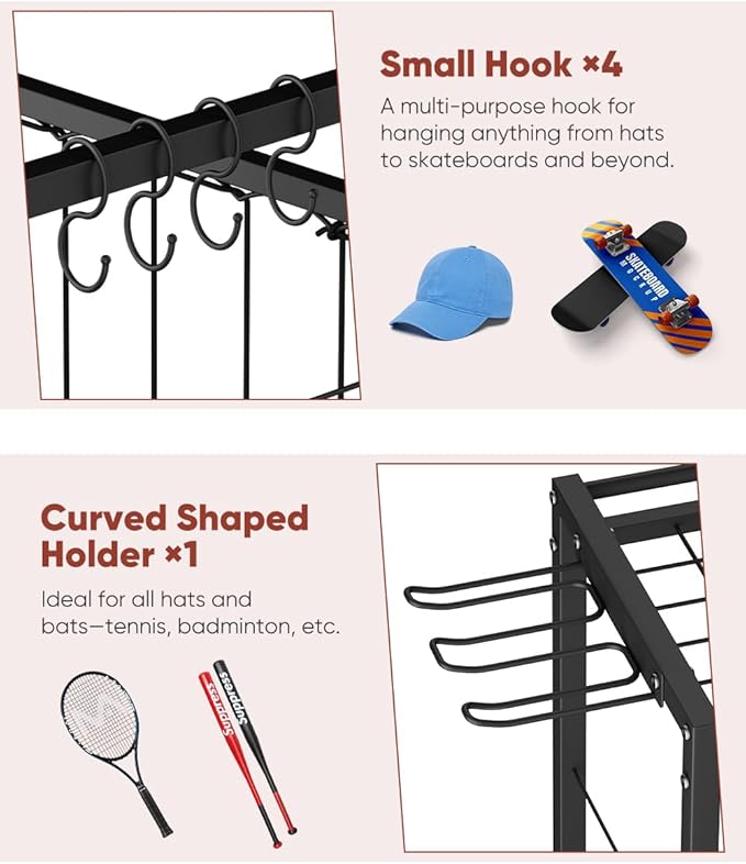 - BASKET FOR SMALL ITEMS: The convenient tray at the top keeps small accessories within reach—perfect for tennis balls, shuttlecocks, dumbbells or kids' toys. This sports storage organizer for garage eliminates loose-item messes wherever you install it.