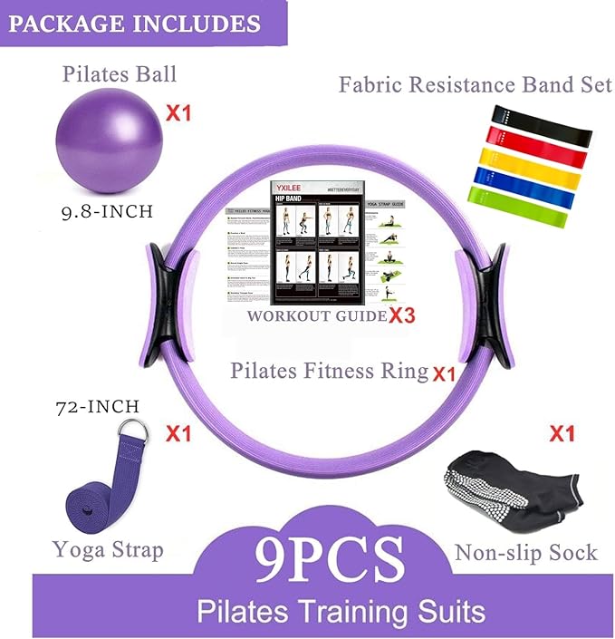 - ★9 PICS PACKAGE INCLUDE★: 1 * 12-inch Fitness Pilates Ring/1 * 9.8-inch Pilates Ball/ 1 *72-inch Yoga strap/1 * Pilates socks /5* 13-Inch Resistance Bands Set/3* Workout Guide Our Pilates suits are carefully selected must-have product combinations, very suitable for beginners and seniors.It has simple and clear exercise instructions on paper &Muti e-Book PDF for you to start. Our workout set is not only better quality but also user-friendly.