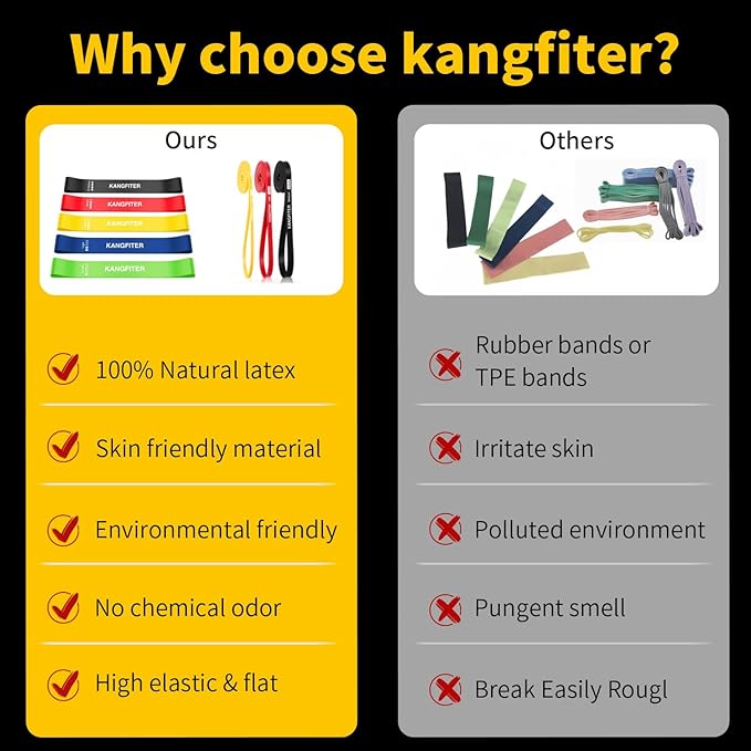 - 【100% Natural Latex】: KANGFITER assistance bands are made of 100% natural latex, non-toxic, no odor and non-slip. Resistance bands are safe and durable, anti-roll and anti-tear, and can maintain high elasticity even after long-term exercise. You can use it with peace of mind and focus better on your training.