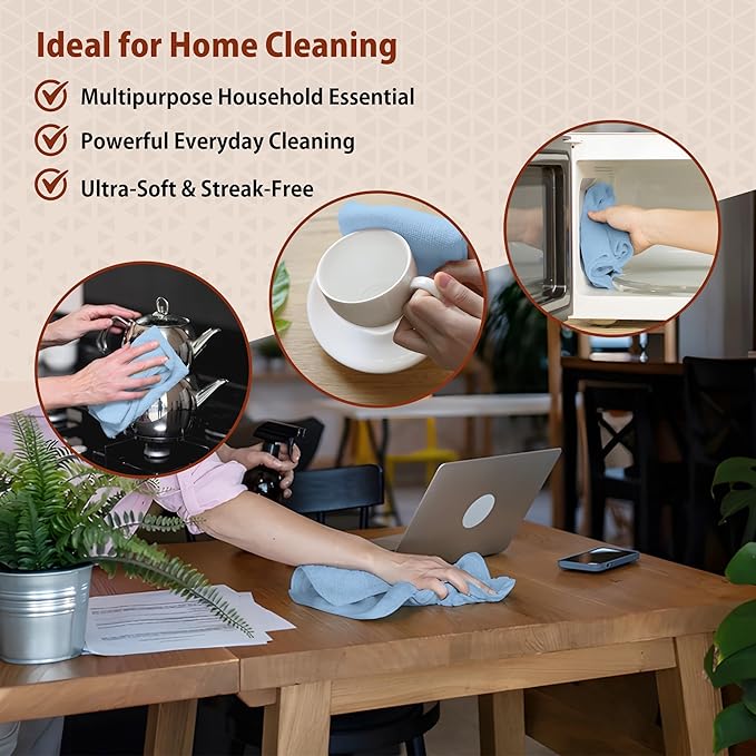 - Microfiber cleaning cloths 11.81x11.81 Inches; provide a soft texture gentle, ideal for cleaning kitchens, garages, workshops, glass, mirrors, windows and stainless steel without leaving residue.