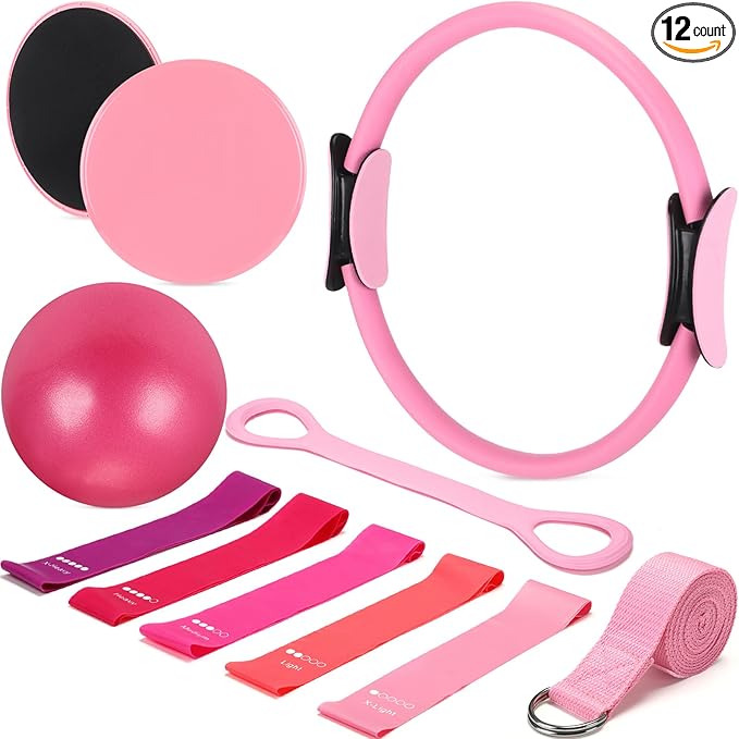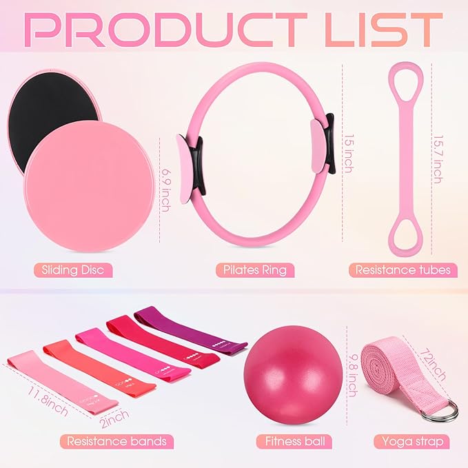 - 6 Exercise Sets: unleash your fitness potential with our comprehensive 6-set Pilates kit! Featuring a 14-inch fitness ring, a 9-inch ball, a 71-inch yoga strap, silicone tension strip, a 5-piece resistance band set, and a pair of sliding discs, these expertly curated essentials cater to both beginners and seasoned practitioners; Elevate your workout routine with these tool, tools designed to enhance your Pilates practice and take your fitness journey to the next level