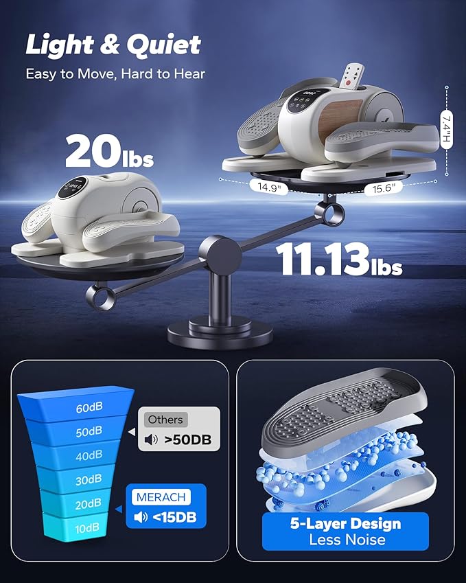 - All-in-One Under Desk Elliptical: Enjoy smooth, low-impact elliptical motion that burns calories and strengthens your legs without straining your joints. Powered by a 60W motor with HR & AUTO modes (P1–P12), forward/reverse, LED touch screen, and remote control, it delivers ultra-quiet performance (<15dB) for home or office workouts. Perfect for seniors, office workers, and those in leg rehabilitation