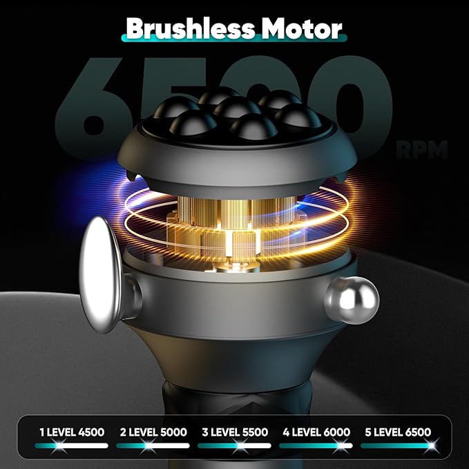 - 【Professional-Grade Deep Tissue Relief】Featuring a powerful 6500 RPM high-frequency vibration, this massage gun delivers deep tissue therapy to break down scar tissue, release muscle spasms, and accelerate recovery—ideal for athletes, fitness enthusiasts, and anyone suffering from chronic muscle tension.