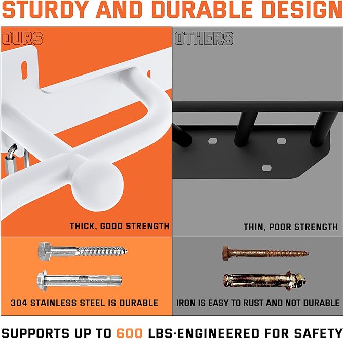 - HEAVY DUTY AND STABLE:This heavy duty pull up bar is fully welded,Made of durable steel tubing,reinforced with 2 steel plates below , our rogue pull up bar can support up to 600 lbs and withstand years of use. The 6-hole design ensures more stability and safety than other wall mounted bars
