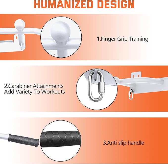 - MULTIPLE WORKOUT OPTIONS:The pull-up bar offers multiple grip options such as wide, narrow, neutral, ball finger and hammer grip, enabling you to target different muscle groups and vary your workouts,And comes with two carabiners, making it versatile for resistance training, suspension training, and strength training