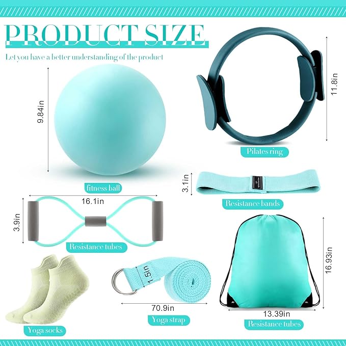 - Suitable Tailored Sizes: understanding that the convenience of exercise equipment lies in the fitting size; The Pilates rings measures 11.81 inches in diameter, the fabric stretching strap is 70.87 x 1.5 inches, the ball 9.84 inches, yoga strap at 23.62 inches in circumference, and the gym back bag is 13.39 x 16.93 inches