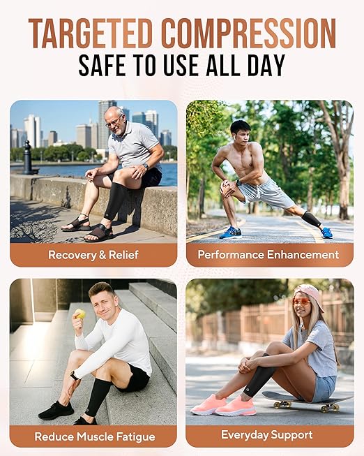 - SECURE FIT WITH BREATHABLE COMFORT: Our lightweight, moisture-wicking copper compression sleeves for calves keep your legs dry and comfortable all day long. Copper calve sleeves have a non-slip design, the copper leg sleeve won’t roll or slide during runs, workouts, or long shifts. Their slim, footless design fits easily under pants or uniforms. This copper leg brace is suitable for both athletic use and daily support, making it a reliable wellness tool in your active lifestyle.