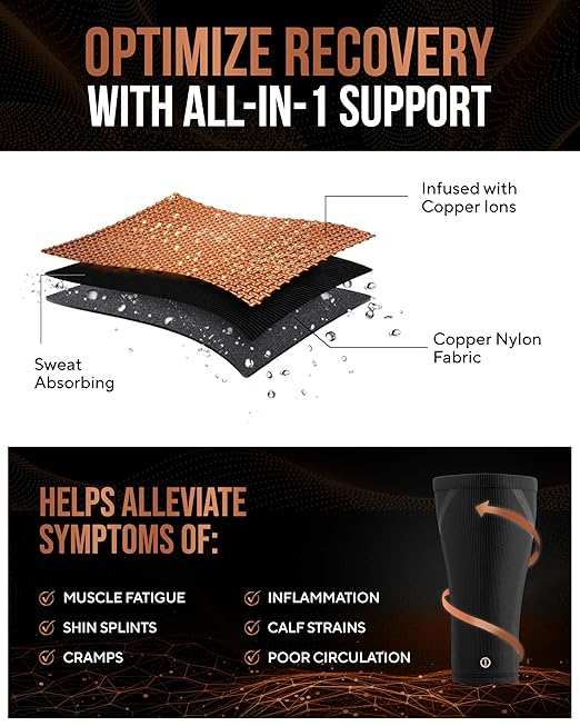 - HIGHEST COPPER CONTENT: Crafted with 62% copper-infused nylon, this womens and mens calf compression sleeve delivers true copper benefits, unlike other alternatives that use low-grade copper oxide coatings. Every thread of our copper compression leg sleeves is infused with real copper ions for enhanced conductivity, odor control, and lasting freshness. Stay supported and comfortable with consistent compression in every wear.