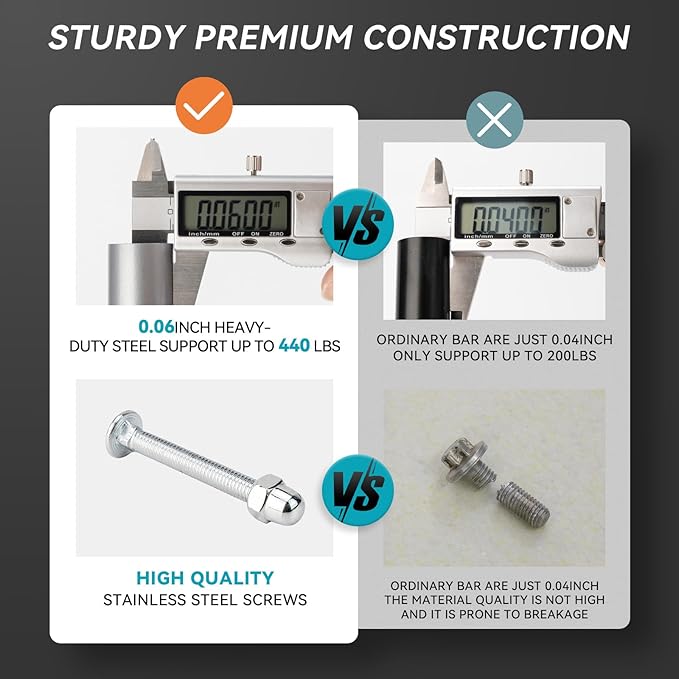 - Sturdy Construction Heavy-duty Bar : Constructed with 1.7mm heavy-duty refinforced steel, the metal chin-up bar ensures sturdiness and reliability, max afford up to 440 pounds ,the bar handgrip has professional-grade comfortable foam for ergonomic gripping.We use high quality self-tighten lock nuts make sure the bar never gets loose