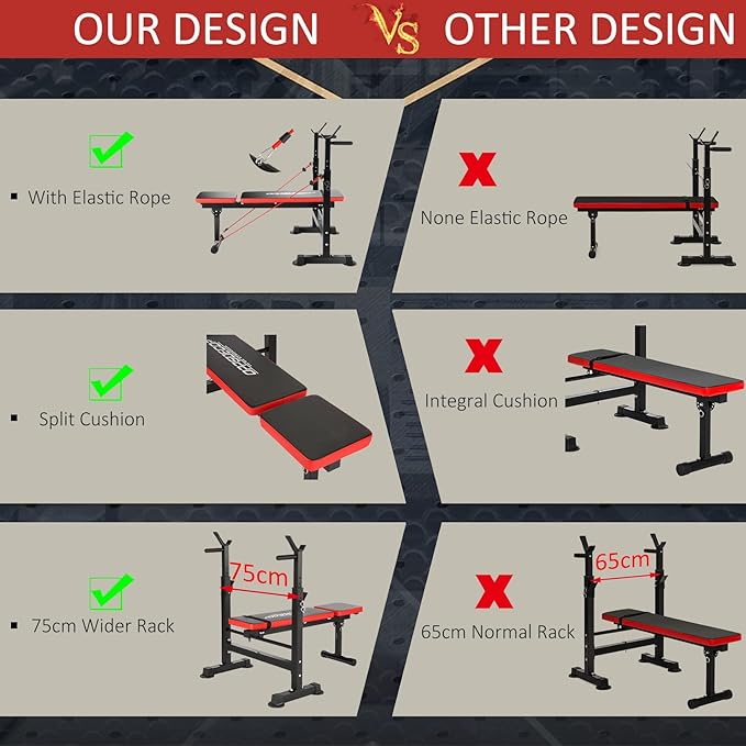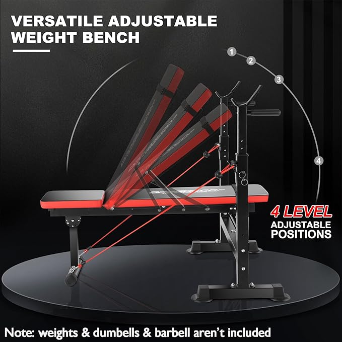 - 【Quick & Easy Adjustments】 Perform 20+ exercises (bench press, squats, pull-ups, sit-up one-arm rowing) with 5 adjustable backrest angles (0°- 80°). Besides, equipped with 2 elastic ropes to exercise your arm muscles, it’s perfect for full-body strength training in limited spaces.