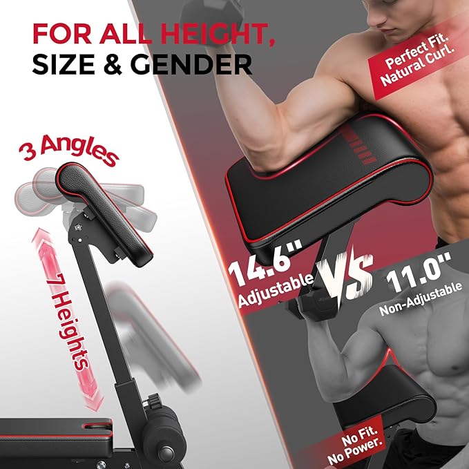 - â ăErgonomic Precision Preacher PadăThe ultra preacher pad measures 14.6" x 10.4" and features a 3-position angle tilt plus 7-level height adjustment, allowing precise alignment for users of various arm lengths and torso heights. Whether you're performing strict curls or back extensions, the pad maintains optimal biomechanics for muscle isolation, improved range of motion, and joint-safe form.