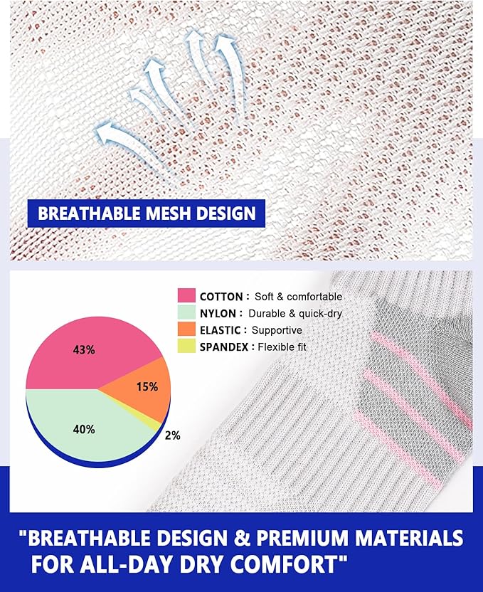 • 🏃Breathable Mesh & Premium Materials -- Thoughtfully designed breathable mesh zones enhance ventilation, effectively removing moisture to keep feet dry. Our golden ratio blend (43% cotton, 40% nylon, 15% elastic, 2% spandex) balances softness with functionality – skin-friendly comfort, durability, and perfect fit without constriction. Stay fresh during intense workouts, travel, flying or all-day wear!