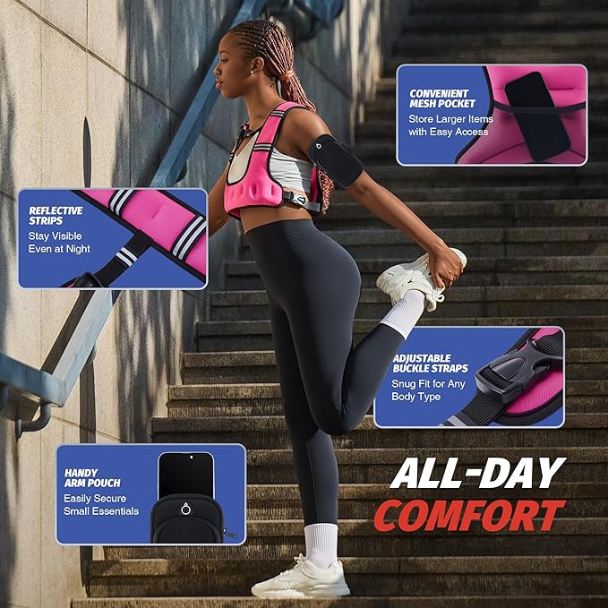 - Snug Fit: The adjustable buckle straps ensure a custom fit that molds to your body shape and size, keeping the weight vest secure and in place during high-intensity movements like sprints, jumps, squats, and HIIT workouts