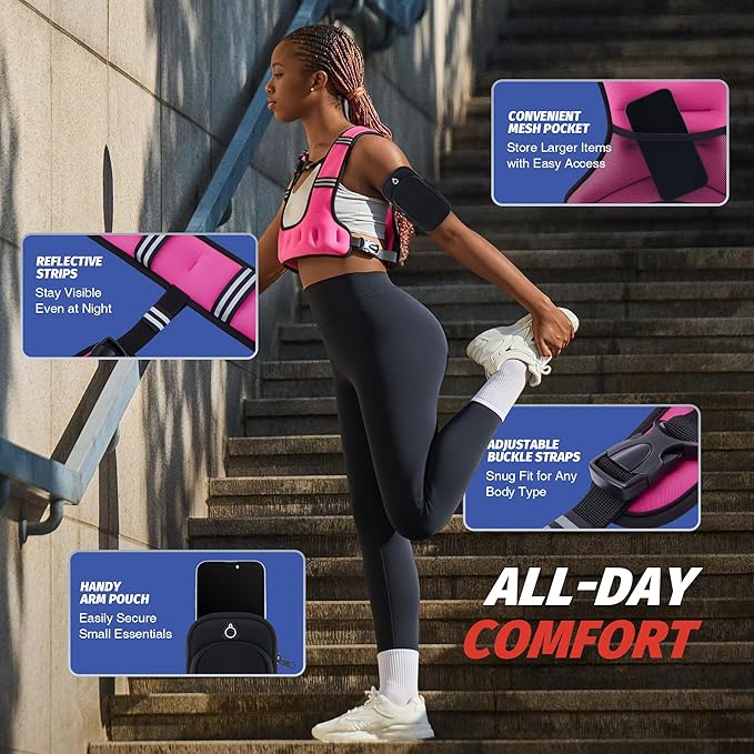 - Convenient & Safe: The odorless adhesive ensures our rucking vest stays secure without irritation or unpleasant smells. The arm pouch holds your essentials, and reflective strips keep you visible and safe during evening or low-light activities