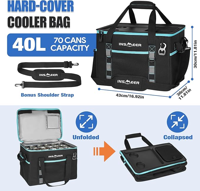 INSMEER Soft Cooler Bag with Hard Shell & 2 Cup Holders, Portable 40L/70 Cans Collapsible Cooler Bags Insulated with Leakproof for Travel, ice chests and Cooler Lunch Box for Beach Camping Picnic
