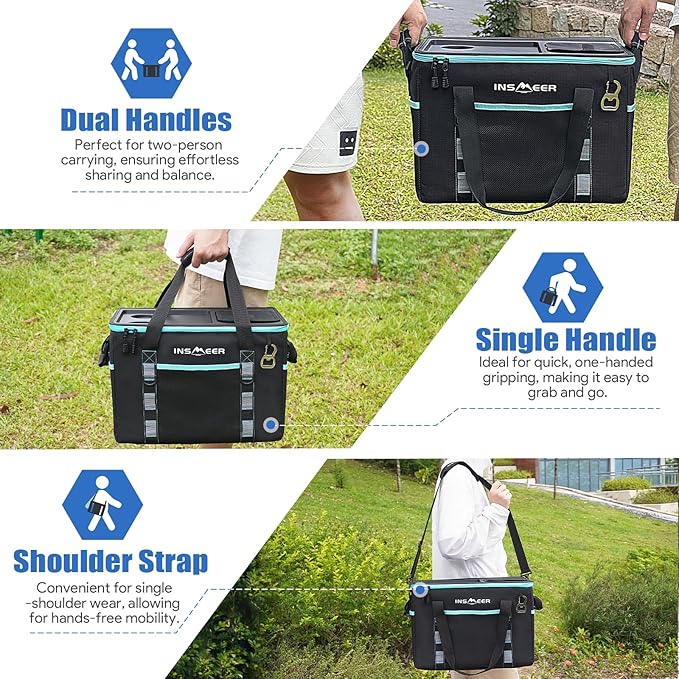 - 【Multi-Pocket and Portable】Our insulated camping cooler boasts mesh pockets – the front perfect for picnic mats or light outdoor essentials, and the sides accommodating umbrellas, flashlights, and various outdoor tools. Designed for portability, it features a single-shoulder strap, dual handles for heavy loads, and front-back handles for solo carry. This insulated bag, a reliable portable cooler and versatile ice chests and coolers, is perfect for outdoor adventures