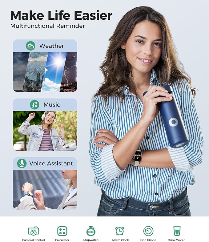 - 【Multiple Practical Functions】The activity trackers and smartwatches with various smart features including menstrual cycle reminder, breathing training, drinking water reminder, sedentary reminder, voice assistant, weather, music, stopwatch, timer, alarm, calculator, find phone, camera control, do-not-disturb mode, making it a convenient assitant in your life. There are 12-hour or 24-hour time display format options and ℉/℃ options, set one style that fits your routines mostly. Double straps, one regular and one extended silicone strap to meet the needs of different people.