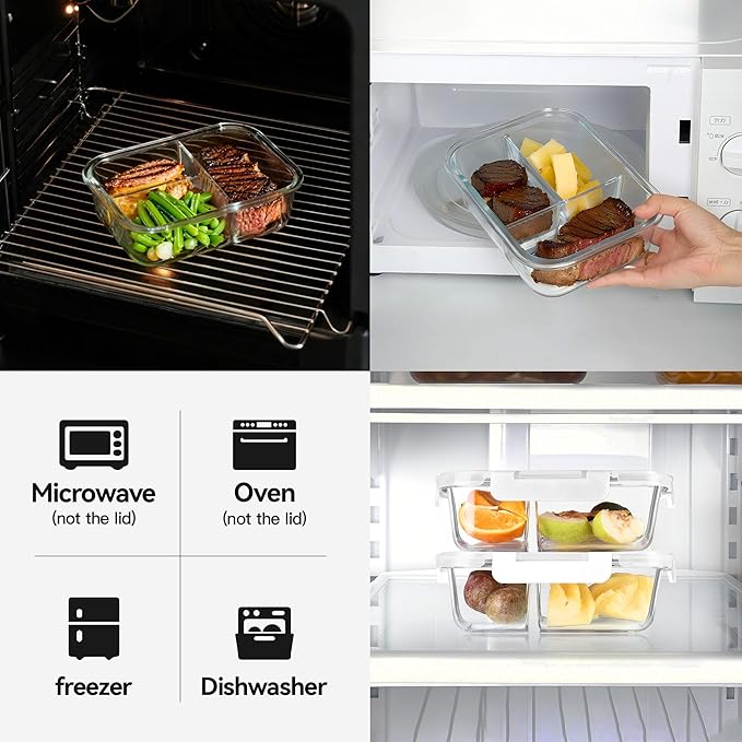 - OVEN, MICROWAVE & FREEZER SAFE: These meal prep containers are made from premium borosilicate glass, which are safe for use in the oven, microwave (without lids), and freezer. Perfect for cooking, storing, and reheating meals - making meal prep with ease and enjoy convenience every day.