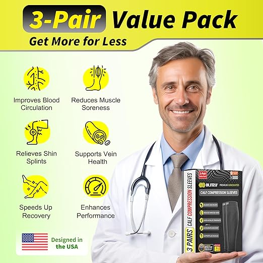 - 3 Pairs Value Pack Enhanced Performance & Exceptional Value: Enjoy superior support and greater savings with this 3-pair set of Calf Compression Sleeves. Perfect for athletes, nurses, travelers, and those with active or standing jobs, this multipack allows for daily rotation, travel convenience, or sharing; delivering comfort, durability, and compression therapy at an unbeatable value.