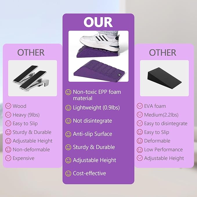 - 【Best Material & Universality & Portability】 - Recyclable, Lightweight, And Sturdy Epp Is More Suitable For Achilles Tendon Stretchers Than Wood Or Metal. It Enables You To Use The Physical Therapy Wedge Kit For Squats, Strengthening Stretches, And Weightlifting To More Effectively Target Muscles. The Use Of Calf Extension Wedges Is Equally Effective For Beginners, Advanced Athletes, And Those Undergoing Physical Therapy. This Lightweight And Compact Set Is A Portable Squat Board That You Can Use At Home, In The Gym, Or Even Outdoors.
