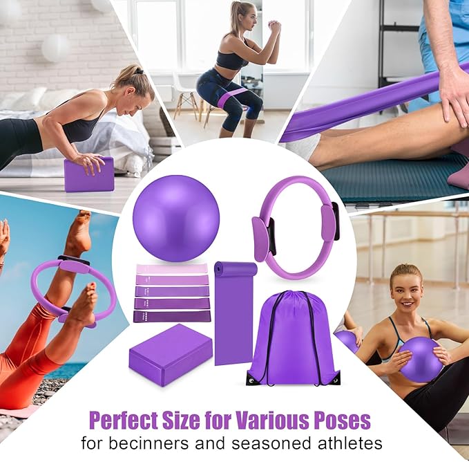 - Comprehensive Pilates Package: this quality pilates equipment set grants you access to a broad spectrum of exercises; It includes 1 pilates ring, 1 pilates ball, 1 yoga brick, 5 yoga straps, 1 elastic band, and 1 fitness bag; This set's nature improves flexibility, agility, and strength in muscles, legs, core, and arms