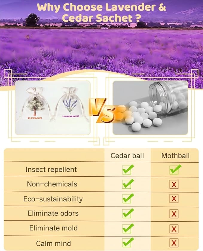 - Natural and Safe: Our sachet bags are made from 100% natural ingredients, providing a safe and eco-friendly option for your family. The combination of cedar blocks for clothes storage and lavender not only imparts a delightful scent but also protects your garments