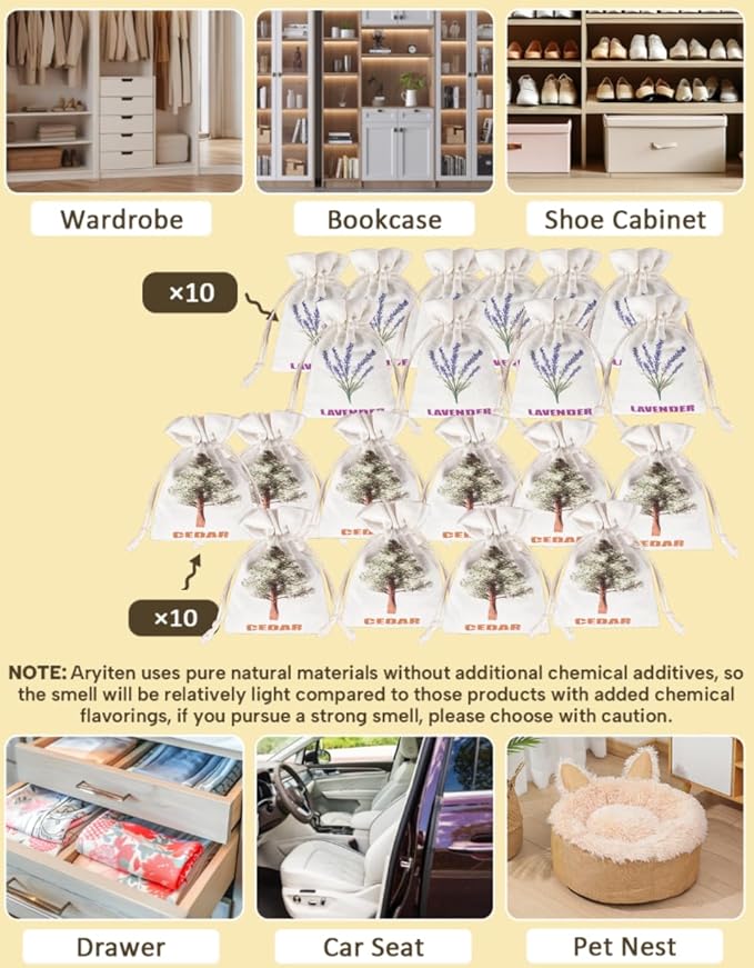 20 Pack Cedar Chips and Natural Dried Lavender Sachets Bags - Stop Clothes Damage, Cedar and Lavendar Home Fragrance Sachets for Drawers and Closets