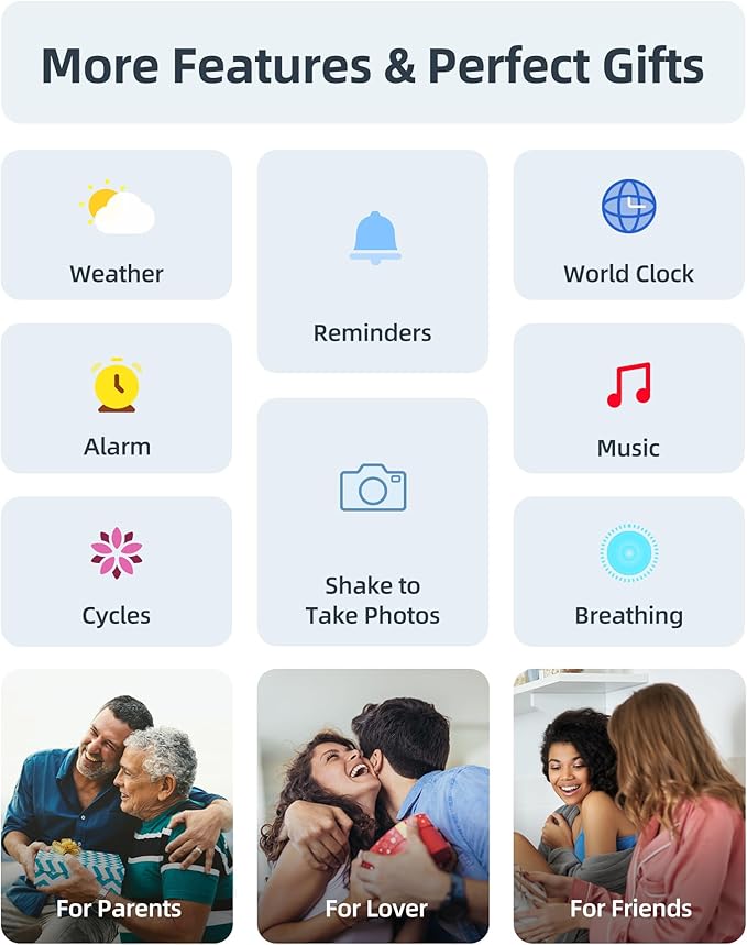 - 【YOUR RELIABLE ASSISTANT WITH SMART ACTIVITY TRACKING】This versatile smartwatch wakes you up, shows weather updates, and reminds you to drink water and stand up. Boost productivity with the Pomodoro timer and use the built-in timer for cooking. Control music, snap photos remotely, and track your activities all day long. Record important events in the app, and get timely reminders to keep your schedule on track. Perfect as a thoughtful gift, backed by 24/7 customer support to keep you covered anytime.