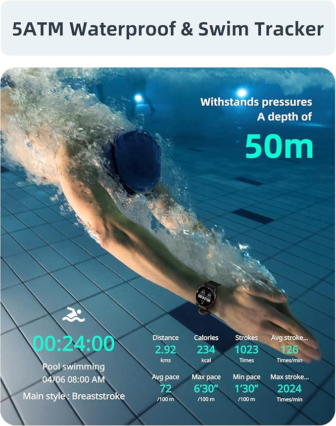 - 【SWIM-READY 5ATM WATERPROOF SMARTWATCH FOR MEN AND WOMEN】This advanced swimming watch is built for swimmers, athletes, and active lifestyles. With 5ATM waterproofing (up to 50m), it’s perfect for pool training, beach workouts, and rainy-day runs. Track swim distance, stroke count, pace, and SWOLF in real time. It auto-detects swim strokes and supports custom pool lengths from 25 to 50 meters for ultra-accurate tracking. As one of the best waterproof watches for men and women, it helps you train smarter, swim faster, and perform better—every time you dive in.