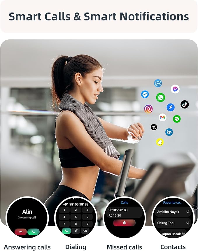 - 【BLUETOOTH 5.3 CALLING & SMART NOTIFICATIONS】This women and men smartwatch offers advanced Bluetooth 5.3 and a noise-cancelling speaker for clear calls. Receive instant alerts for WhatsApp, Facebook, TikTok, SMS, email, etc., right on your wrist without checking your phone. Sync with the companion app to customize notifications and track activity. Lightweight, cool, and packed with smart features, it’s perfect for any lifestyle. (Note: Direct SMS reply from the watch is not supported.)