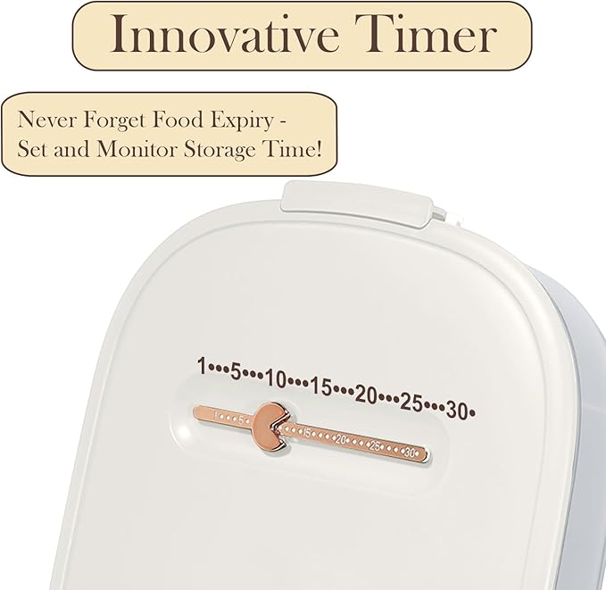 - BUILT-IN TIMER DIAL – NO MORE FORGOTTEN FOOD Track freshness easily with the adjustable date dial. Set the storage day and know exactly when to cook—without sticky labels or guesswork.