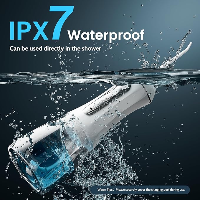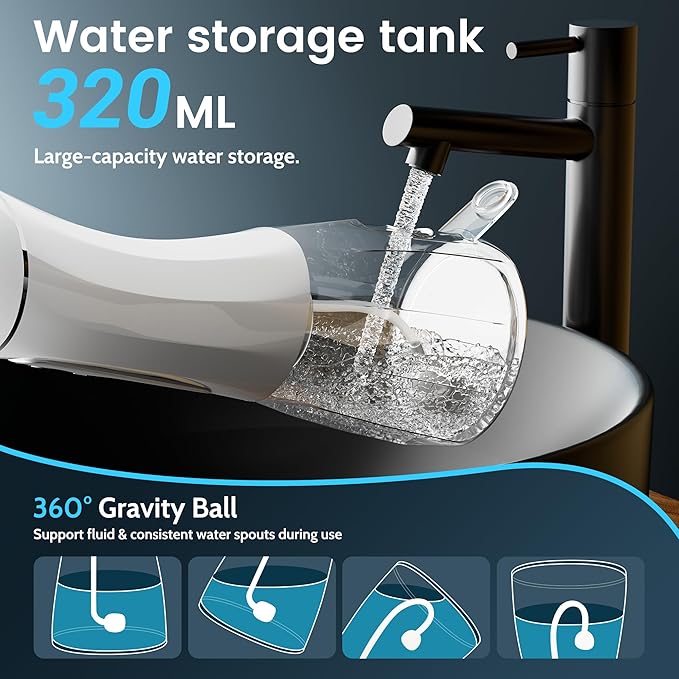 - Convenient and Easy to Use: Equipped with an 320 ml extra-large water tank, our water flosser for teeth allows for uninterrupted cleaning without the need for frequent refills. The wide-mouth design makes filling and cleaning the tank quick and easy. With an IPX7 waterproof rating, you can safely use it in the shower. The ergonomic handle and multiple interchangeable tips ensure a comfortable grip and versatile use