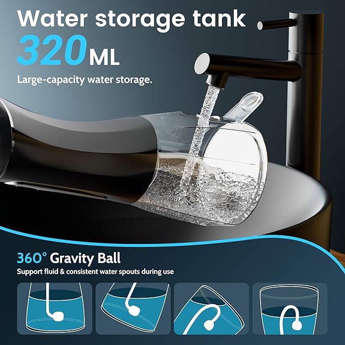 - Convenient and Easy to Use: Equipped with an 320 ml extra-large water tank, our water flosser for teeth allows for uninterrupted cleaning without the need for frequent refills. The wide-mouth design makes filling and cleaning the tank quick and easy. With an IPX7 waterproof rating, you can safely use it in the shower. The ergonomic handle and multiple interchangeable tips ensure a comfortable grip and versatile use