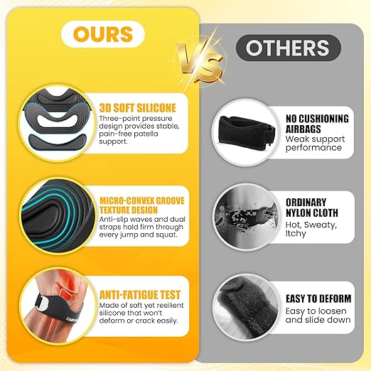 - [Comfortable and Soft]: Built with soft silicone and breathable materials, this patella tendon knee strap cushions your movement without adding bulk. The integrated air-cushion pad offers light compression and a massaging effect — reducing fatigue and sweat buildup