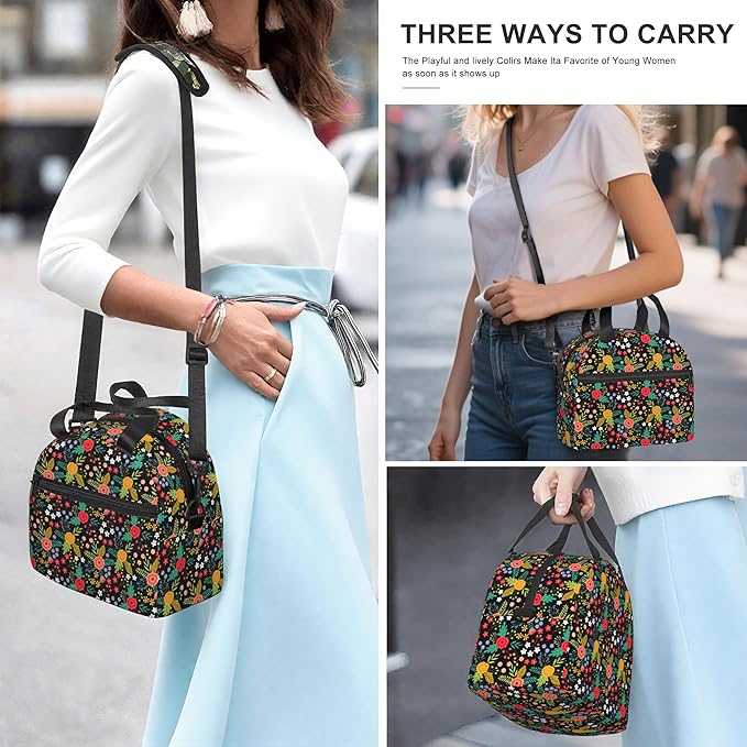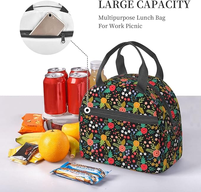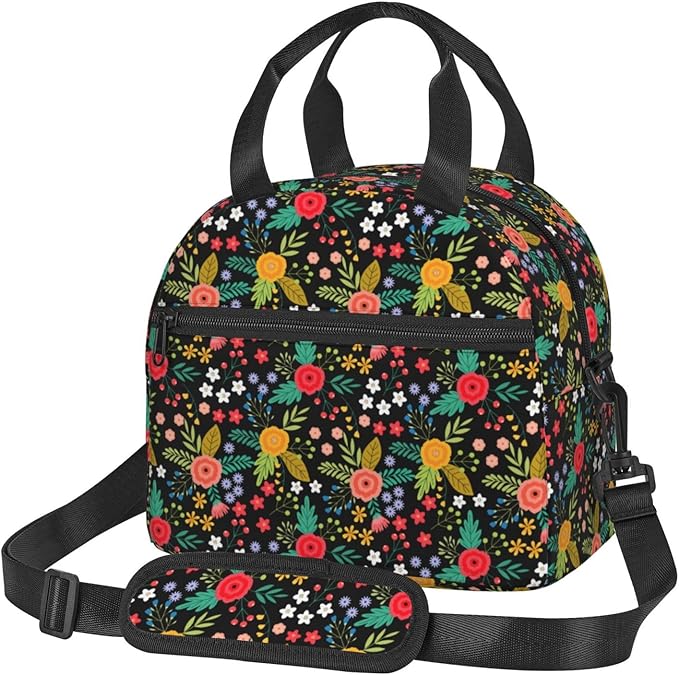 Flower Reusable Insulated Lunch Box Waterproof Lunch Bag with Detachable and Adjustable Shoulder Strap for Office Picnic or Travel