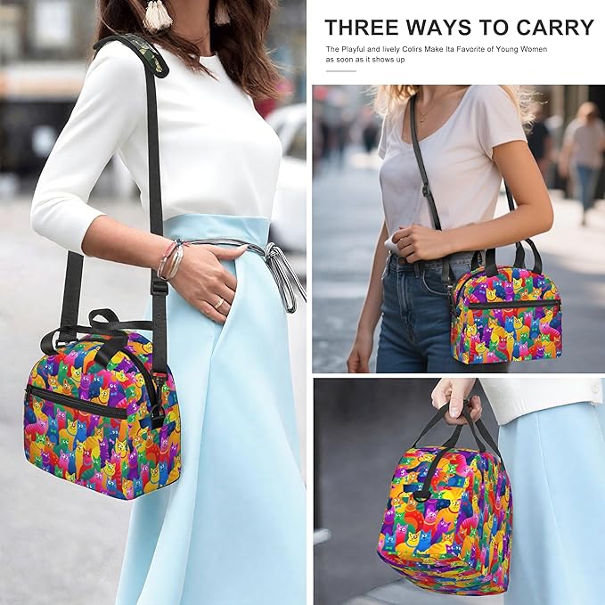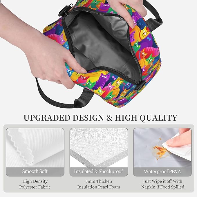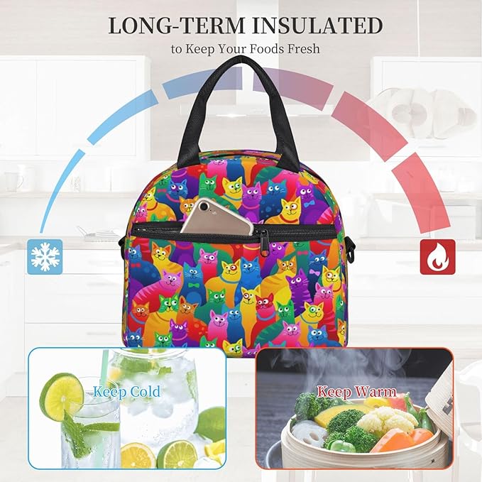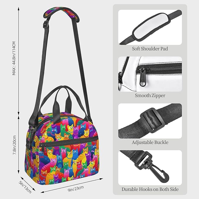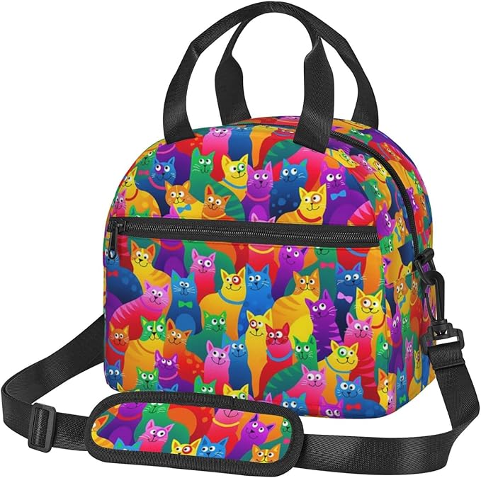 Colorful Cat Reusable Insulated Lunch Box Waterproof Lunch Bag with Detachable and Adjustable Shoulder Strap for Office Picnic or Travel