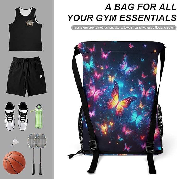 - Generous Storage Capacity: Ample space for clothing, shoes, towels, books, keys, cosmetics, wallet, and more, this butterfly drawstring backpack provides abundant storage for all your essentials. Awesome for gym, travel, work, and various activities.