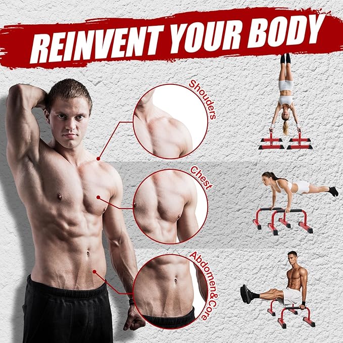 - Versatile for Full Body Exercise: This dip bars can be used for exercising shoulders, arms, waist, and leg muscles. The gym equipment also can be used for push-ups training, which is a common exercise for strengthening the core