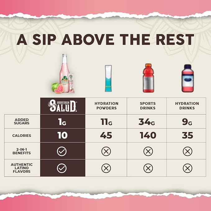 - US vs THEM - Unlike other sports drinks and hydration multipliers that are loaded with sugars and artificial dyes, Salud will turn plain water into a mouth-watering Agua Fresca drink with only 1g of added sugar and 10 calories per serving. So delicious you might forget each serving is packed full of powerful benefits!
