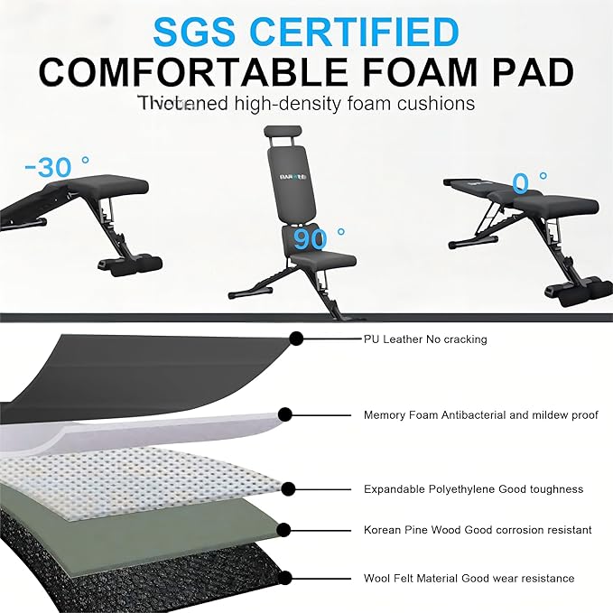 - 【Pro-Grade Padding That Outperforms Competitors】 The workout bench with weights features 3cm thicker high-density foam than standard flat weight training benches, with extra 2cm at lumbar/headrest. Military-grade leather makes this exercise bench for home more durable than fitness reality bench .
