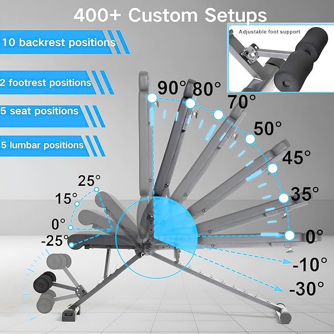 - 【400+ Custom Setups - 4 Positions Adjustable Bench Available】 This gym bench adjustable system offers 10 backrest/5 seat/2 footrest/5 lumbar positions - creating over 400 combinations for your bench workout. You only need 5 seconds to transform this foldable weight bench for home from flat workout bench to incline weight bench instantly, surpassing regular adjustable weight benches for home gym.