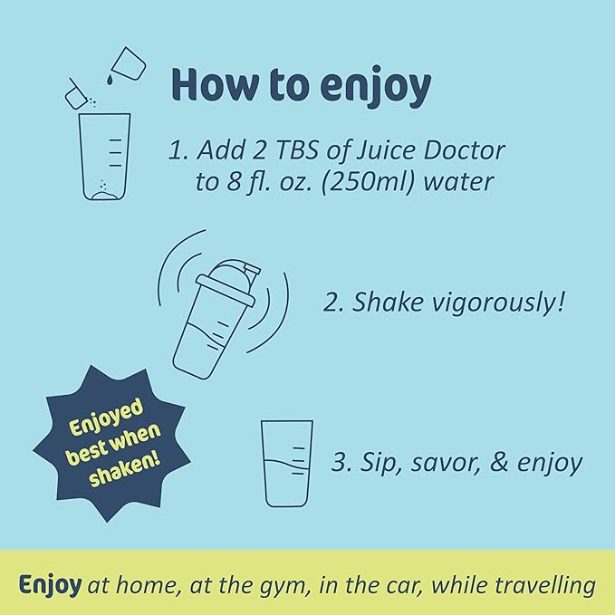 - SHAKEN, NOT STIRRED: For the best preparation of electrolytes, please add one serving of Juice Doctor (2 Tablespoons / 20 Grams) to 8 fluid ounces (250ml-500ml) of water in your clear cup. SHAKE VIGOROUSLY, let it sit for 1-2 minutes, and enjoy!